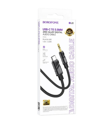 Кабель AUX Borofone BL22 3.5mm to Type-C предназначен для подключения аудиоустройств с разъемом 3.5 мм к устройствам с портом USB Type-C. Он обеспечивает качественную передачу звука, имеет крепкую конструкцию и стильный черный дизайн. Идеально подходит для смартфонов без стандартного аудиоразъема.