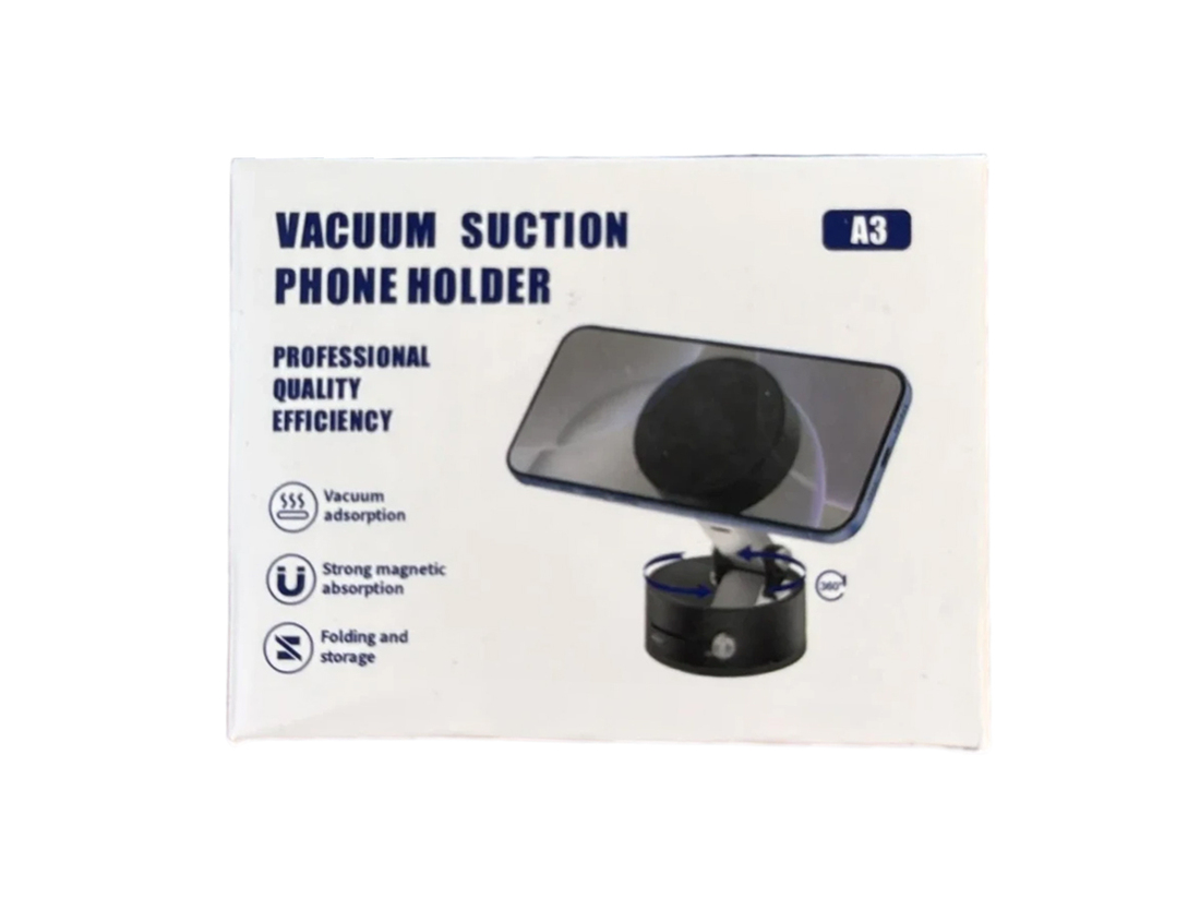 Вакуумный держатель для смартфона A3 — компактный и мощный аксессуар, который прочно удерживает телефон благодаря сочетанию вакуумного крепления и сильного магнита. Отлично подходит для установки на рабочем столе, кухонной поверхности или любой гладкой плоскости.