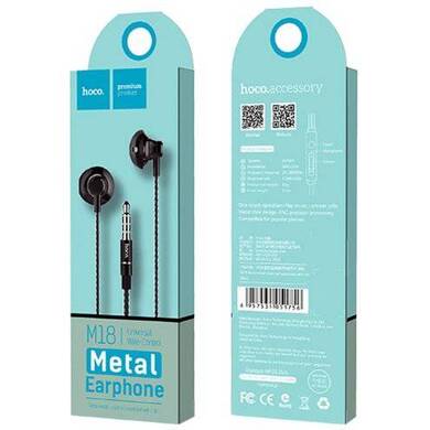 Hoco M18  - универсальная портативная гарнитура для мобильных устройств. Компактные вставные наушники, изготовленные в алюминиевом корпусе, отличаются малым весом и комфортной посадкой. Функциональный пульт со встроенным микрофоном оснащен кнопкой приема приема вызовов и регулятором громкости. Кабель гарнитуры имеет прочную эластичную оболочку и длину 1.2 метра.