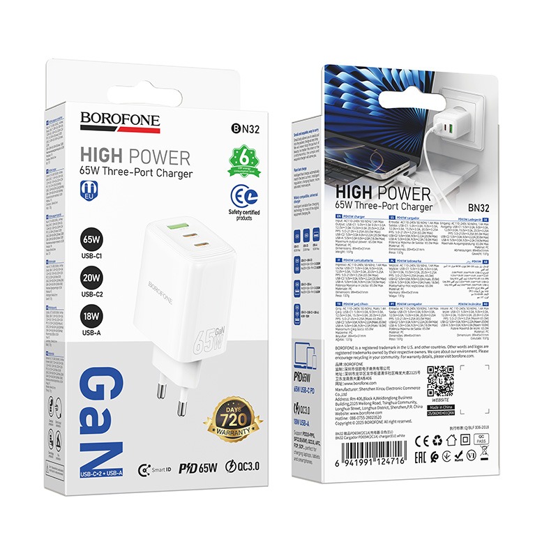 Сетевое зарядное устройство Borofone BN32 (65W) — мощное и универсальное решение для быстрой зарядки смартфонов, планшетов, ноутбуков и других устройств.