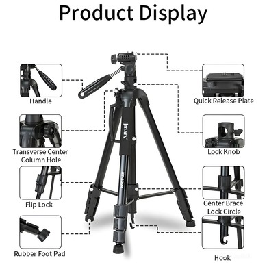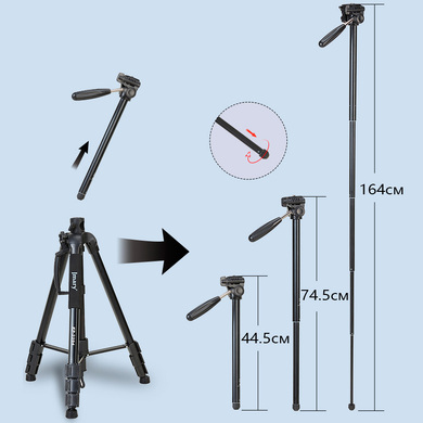 Телескопическая конструкция позволяет регулировать высоту штатива от 57,5 до 179 см – что позволяет выбрать оптимальное положение для съемки. В сложенном виде штатив занимает немного места - 60 см в длину.