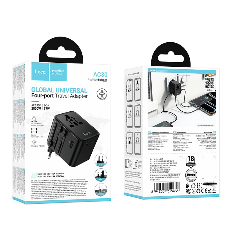 Главная Зарядные устройства Cетевой адаптер Универсальный адаптер Hoco Универсальный адаптер Hoco AC30