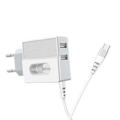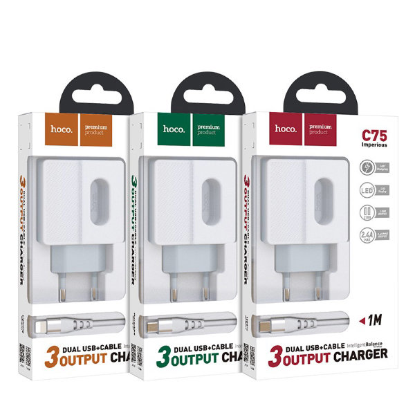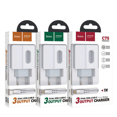 Адаптер питания Hoco C75  - это сетевая зарядка с двумя USB портами и встроенным кабелем длиной 1 метр. Адаптер питания Hoco имеет вилку европейского стандарта. Для уверенной работы адаптеру питания на входе требуется переменный ток 100-240 вольт 0.3 ампера. USB зарядка Hoco изготовлена из огнеупорных материалов и снабжена функцией интеллектуального автоматического определения параметров заряда (IC), необходимых для подключённого устройства.