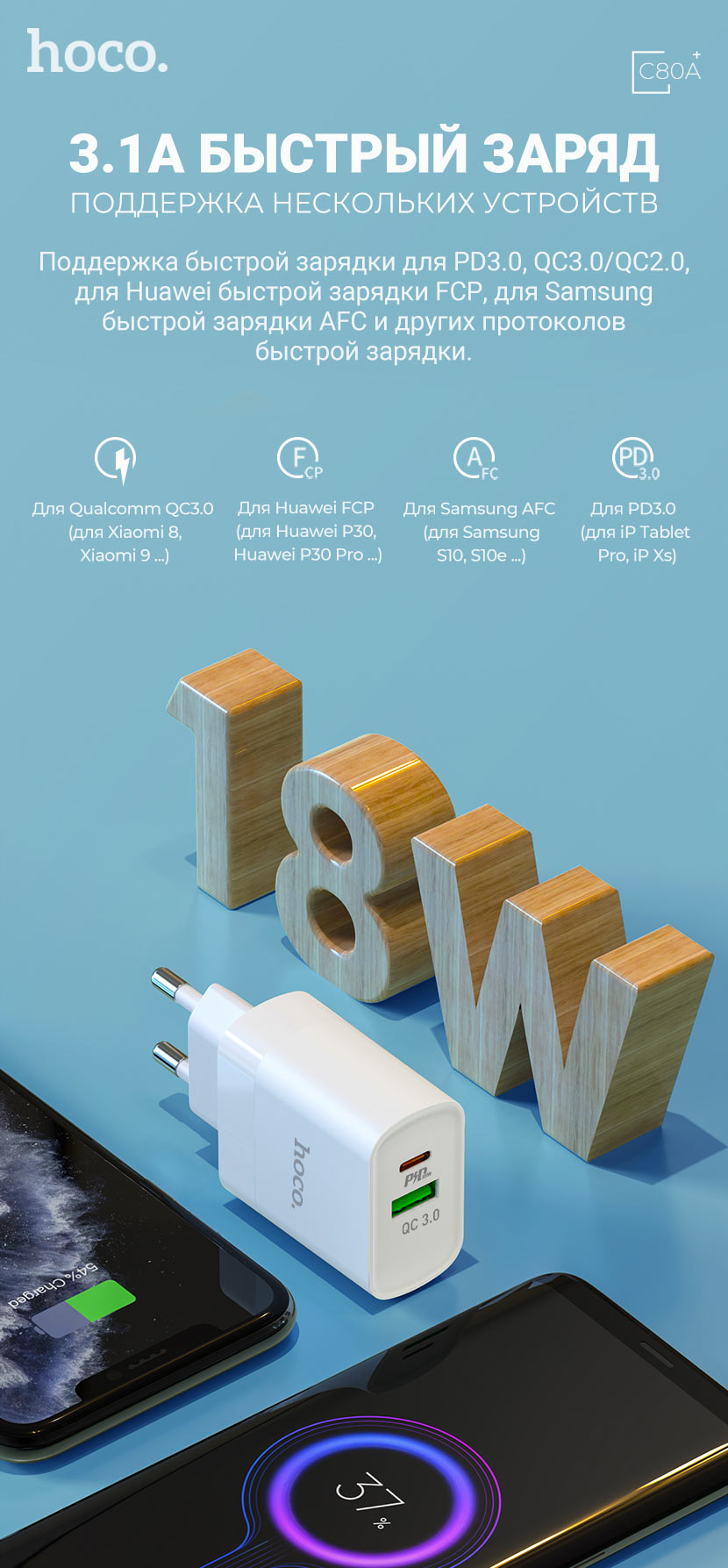 Главная Зарядные устройства Cетевой адаптер Hoco Зарядное устройство Hoco “C80A Rapido” PD + QC3.0