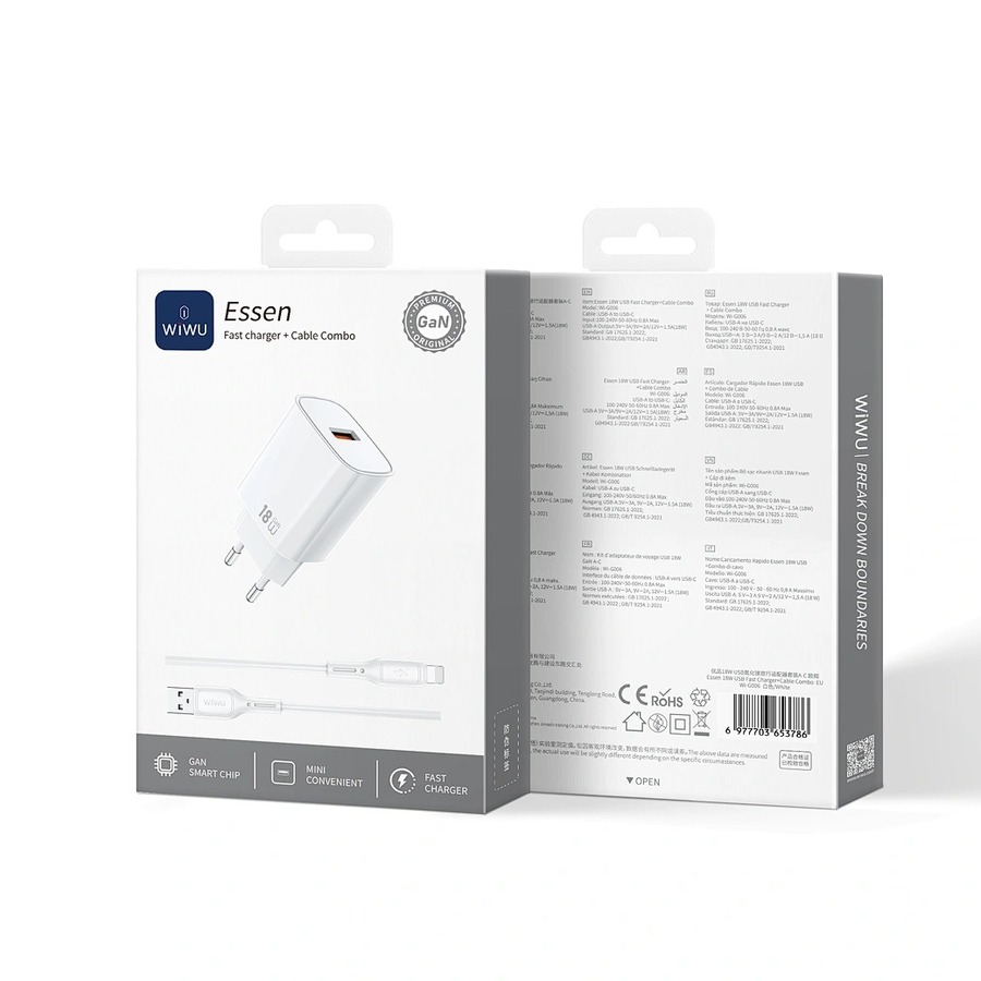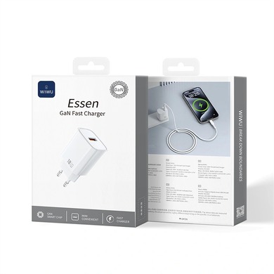 Сетевое зарядное устройство WiWU 18 Вт Essen GaN Fast с портом USB-A обеспечивает эффективную и быструю зарядку благодаря передовой технологии нитрида галлия. Устройство совместимо с вилками Европейского стандартов и отличается компактным дизайном без ущерба для мощности. Это зарядное устройство идеально подходит для быстрой зарядки смартфонов и других устройств с питанием через USB. Оно обеспечивает надёжную работу и безопасность благодаря интеллектуальному управлению питанием. Благодаря лёгкому весу он идеально подходит для путешествий и повседневного использования.